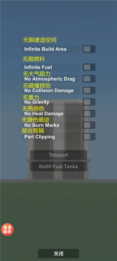 3、可开启无限建造空间、无限燃料、无大气阻力等功能,玩家可根据需求自行设置(附上翻译图)。