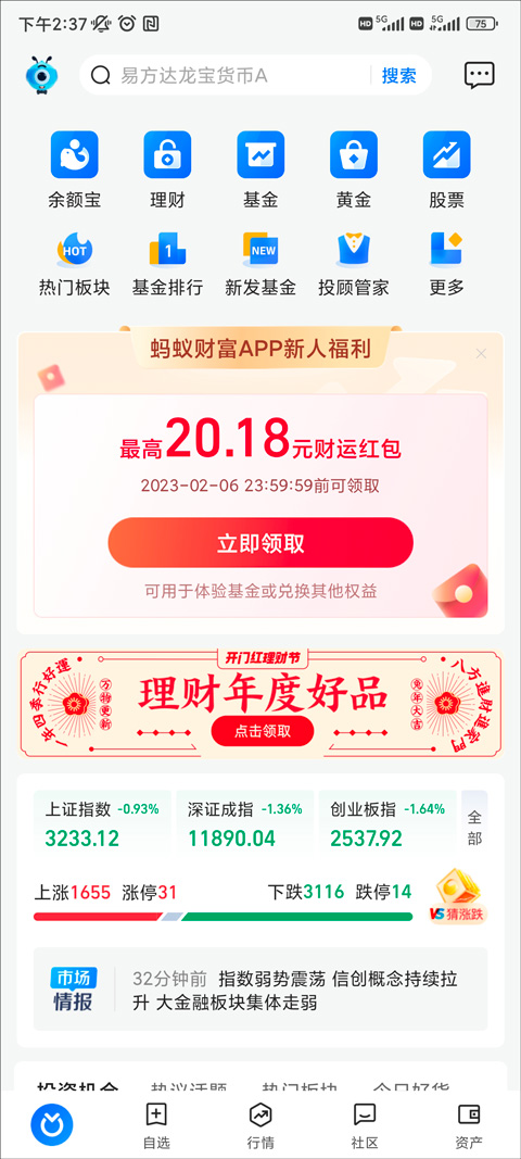 蚂蚁财富的一大特点是界面简洁直观,功能齐全。首页提供了丰富的理财品类和实时资讯,自选功能让投资者轻松跟踪关注的股票和基金,而行情板块则覆盖了沪深、港股和美股市场。此外,平台还提供智能理财助手,帮助用户更好地管理资产。