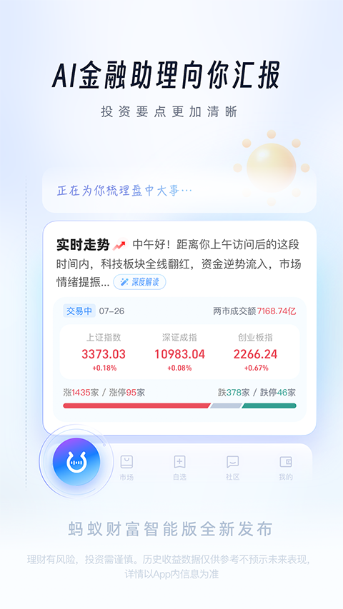 蚂蚁财富拥有财经资讯、市场行情、社区交流、智能理财顾问等服务,用户可随时随地了解金融行情,操作也特别简单,能够使用一个账号,在蚂蚁财富平台上实现余额宝、招财宝、存金宝、基金等各类理财产品的交易,让理财实现“小确幸”。