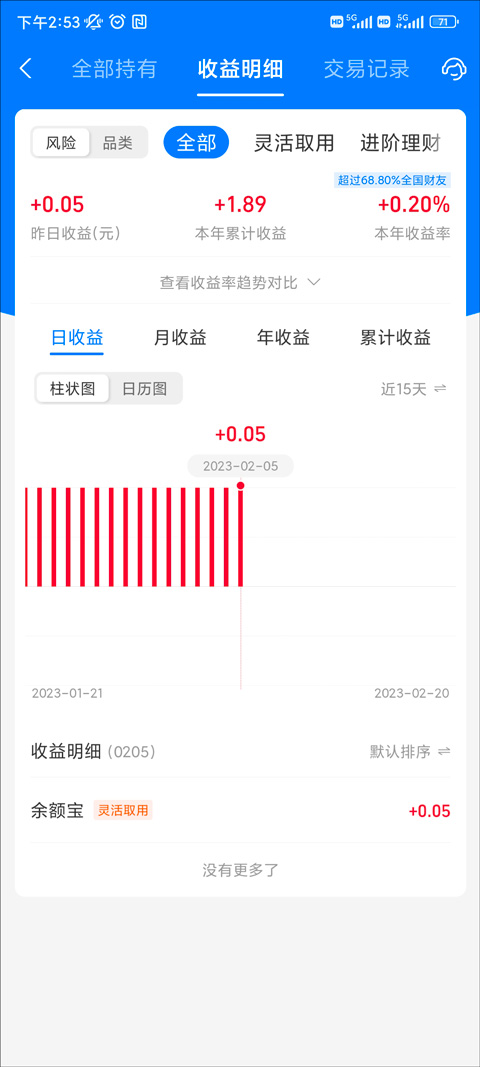 3、在我的资产详细中可以看到全部持有、收益明细、交易记录等等;