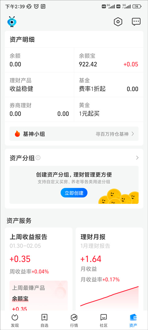资产结构简单明了,每日收益一目了然,支持自定义创建资产分组,资产管理更清晰。