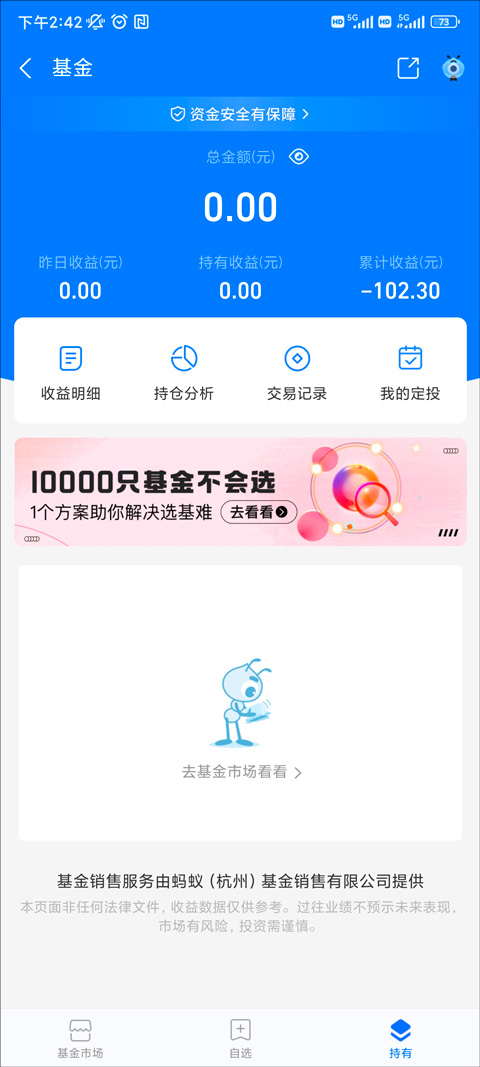 4、进入基金页面,在这里可以查看自选的基金以及你拥有的基金