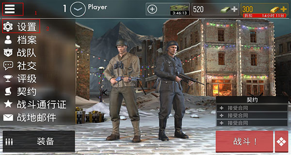1、下载安装好二战英雄最新版中文版,运行游戏后登录进入下图界面,在左上角有三杠标志,选择设置;