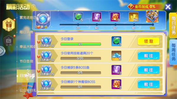 1、完成每日/成就任务可获得免费金币和各种道具奖励