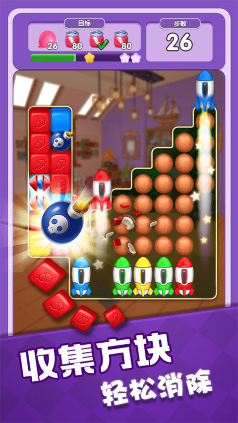 4、火箭+火箭 释放效果:清除一整行和一整列的方块或障碍!道具合成方式 火箭 合成方式:5个(或6个)同色方块可以合成火箭 释放效果:点击火箭可以消除一整行或一整列方块!