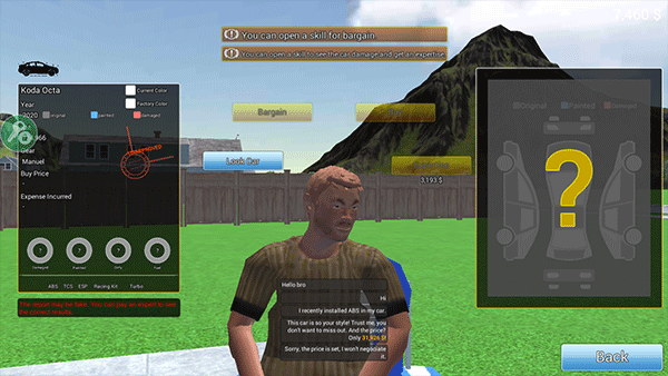 9、然后与邻居讨价还价,并以最低价购买到汽车(邻居提供的证书可能会造价,你只有找到这些错误才可以砍价哦)。最后购买到汽车后,你就可以将汽车放在自己的汽车店内进行交易、升级来赚取金钱