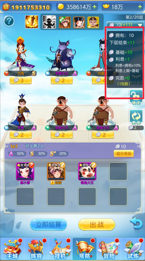 战棋中的利息:每关基础为10,每关利息获得为手上银币的10%,完胜:满血过关越多银币给的越多,具体看下棋页面右上角(英雄买卖都是100%银币消耗和返还)