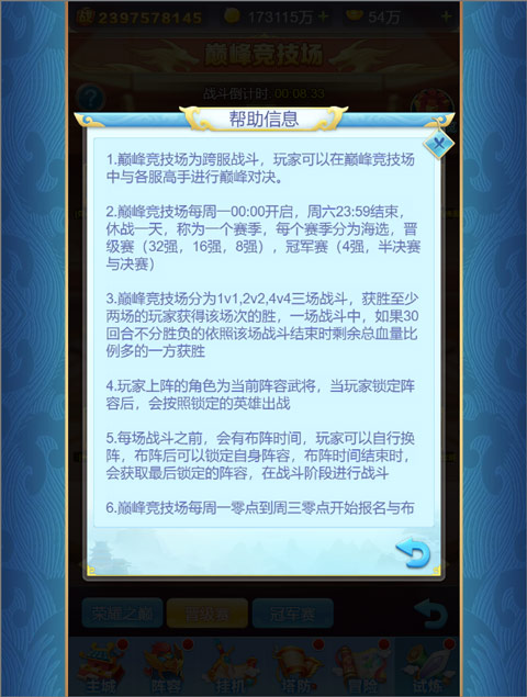 巅峰竞技场为跨服PK玩法,一周为一个赛季。