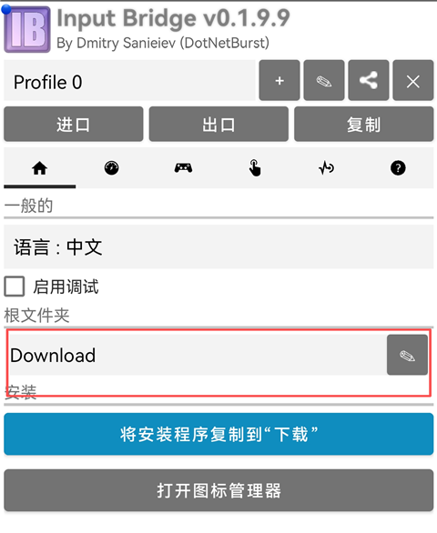 1、打开InputBridge官方版软件,点击【根文件夹】,选择你创建的ExaGear模拟器文件,这里是【ExaGear】文件夹。(点击前往下载ExaGear模拟器)