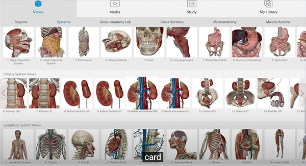 在屏幕上或通过增强现实(AR)技术解剖3D解剖模型。观看 3D 动画,了解气体交换、肺通气、体液平衡、蠕动、肌肉收缩等知识。查看组织切片和诊断图像。