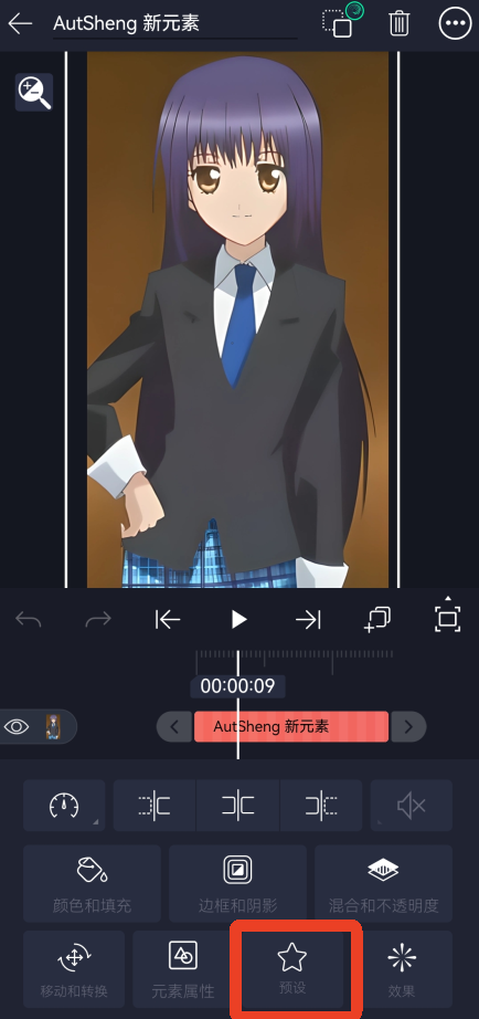 1、点击素材后,再点击弹出页面里面的【预设】,这个星星符号的。