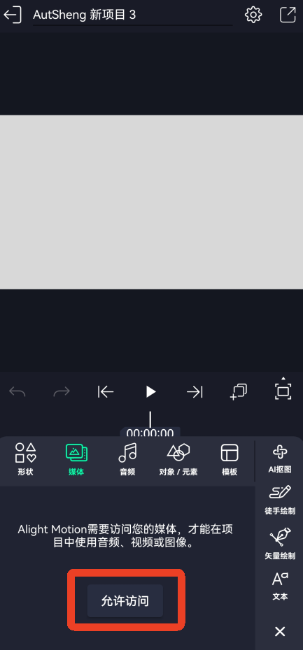 2、点击第二个媒体,需要允许AutSheng官方版访问我们的文件,点击【允许访问】,没有反应的话自行去设置里的权限管理开启权限。先导入一张图片。
