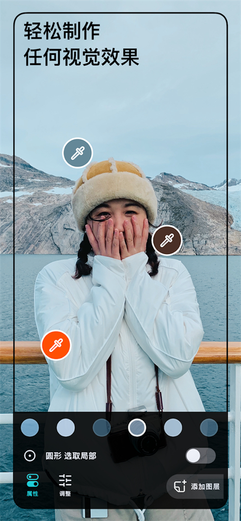 利用泼辣修图的局部调整工具,我们可以对画面中不同的区域采用不同的调整方法,从而实现更加精细的调整。泼辣修图中的局部调整包括选色调整、笔刷调整、圆形调整、渐变调整,我们可以同时应用多个局部调整。