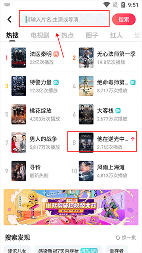2、会看见很多的近期热搜推荐,如“法医秦明、无心法师第一季、特警力量、绝命毒师、桃花绽放、大客栈、男人的战争、以及他在逆光中”,这里小编选择他在逆光中,作为示例,如果推荐中没有你想要的,在搜索框搜索即可;