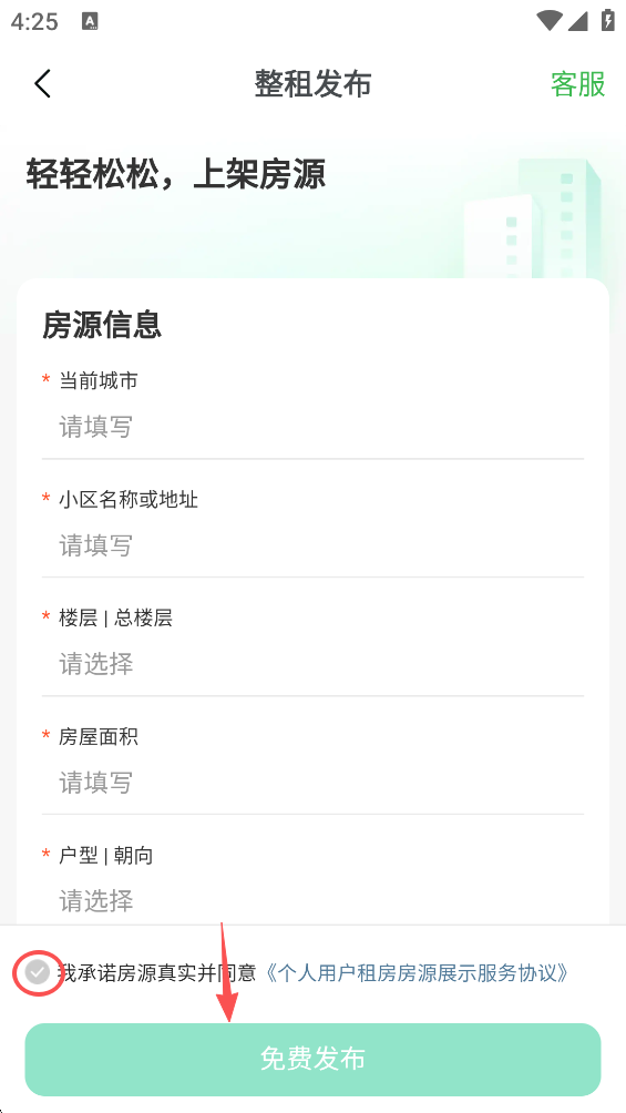 4、当输入相关信息后,勾选屏幕下方的“我承诺房源...”,随后点击屏幕下方的“免费发布”。