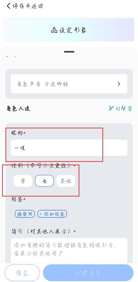 7、接下来就是填写角色简介以及角色设定,然后点击【创建角色】。