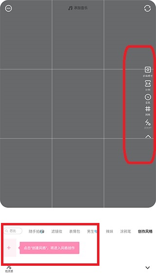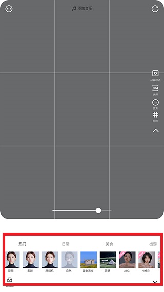 4、在拍摄框中间有闪光灯、倒计时、姿势、比例、模式和焦距等参数调整;