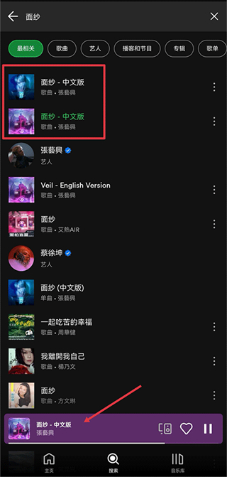2、搜索结果加载完成后,点击目标音乐即可试听,并进入对应的播放页面。