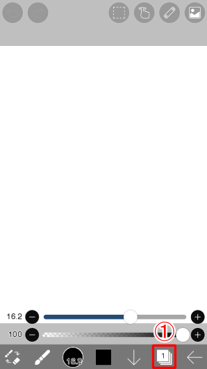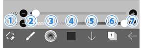 上图显示了主工具栏。按钮从左到右依次为: ①[ 画笔/橡皮擦 ]、 ②[ 工具选择 ],③[ 属性 ], ④[ 色彩 ],⑤[ 全屏幕 ],⑥[ 图层 ]和⑦[ 返回 ].