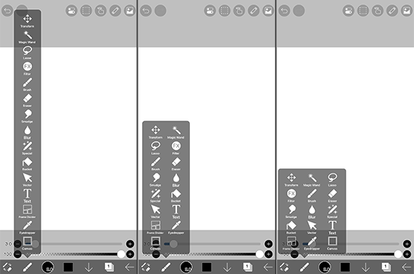 这些工具从上到下依次是:①[ 变换工具 ], ②[ 魔棒工具 ], ③[ 套索工具 ], ④[ 滤镜工具 ]、⑤[ 画笔工具 ]、 ⑥[ 橡皮擦工具 ], ⑦[ 涂抹工具 ]、 ⑧[ 模糊工具 ]、 ⑨[ 特殊钢笔工具 ]、 ⑩[ 油漆桶工具 ],⑪[ 矢量工具 ],⑫[ 文本工具 ],⑬[ 帧分隔器工具 ]、⑭[ 吸管工具 ]、 ⑮[ 画布工具 ]。