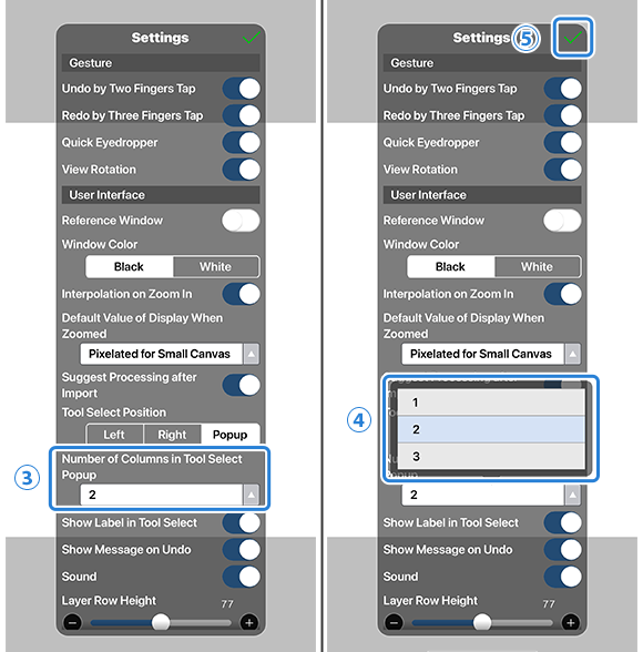 点击 ③[ 工具选择弹出窗口中的列数 ]。选择所需的列数 (※1, ※2) 从可用选项 ④[ 1 列, 2 列, 3 列 ] 并点按 ⑤[ ✓ ] 中。