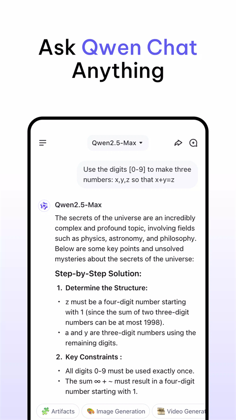 Qwen Chat手机版是一款面向所有人的AI助手,由通义系列模型提供支持。它免费使用,对所有人开放,随时准备帮助您发挥创意、协作和无限可能。只要提问,剩下的交给Qwen Chat 。Qwen Chat 提供涵盖聊天机器人、图像和视频解析、图片生成、文档处理、网页搜索集成等全方位功能。