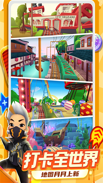 地铁跑酷2026官方正版是一款非常经典有趣的美式街头风格跑酷游戏,游戏背景设定是在地铁轨道上,在游戏中异域风情随处可见,极具特色的地铁、特色的城市美景,在你眼中大方光彩,以最绚烂最美丽的一面刻印在你的脑海中,让你足不出户就能够欣赏世界的美景。游戏主角是大家熟悉的调皮鬼杰克,玩家需要帮助杰克来躲避警察的追捕,在跑酷的过程中会有各种的路障和阻碍,你需要躲过这些阻碍,并且铁轨上还有一些道具能够快速帮助你躲避警察的追捕,有些道具会帮助你吸取附近的金币,或者帮助你飞行等等,总之越到后面难度也会越高。同时地铁跑酷的操作模式也是非常的简单,只需要玩家们通过简单的向上划,向下划,向左向右划来躲避障碍和迎面而来的火车,帮助主人公躲避脾气暴躁的警察和他的狗的追捕,只要你不是正面撞击到障碍物就可以一直奔跑下去,一起来见证一下到底终点是什么样吧。
