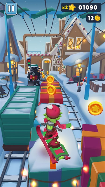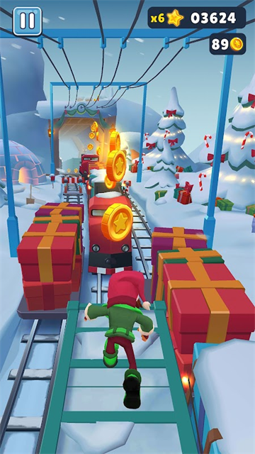 升级技能和完成任务可以增加金币和倍数,使用道具还能冲刺或加分。玩的时候要专注冷静,避免不必要的死亡。这次更新还增加了北极主题,玩家可以在极光下滑行,解锁各种节日造型的皮肤,比如麋鹿、雪人等。