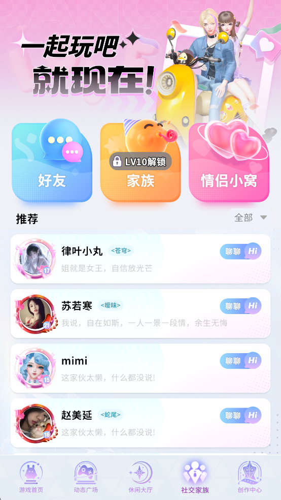 在游戏中你可以添加好友,加入家族组队征战,建造温暖情侣小窝等