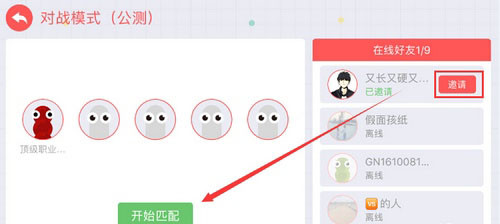2、在对战界面点击开始匹配,系统会自动给你匹配对手,稍等一会即可进入联网对战房间,当然你也可以邀请自己的好友一起进入房间对战。