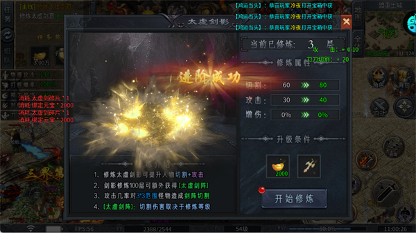 消耗材料修炼太虚剑影,提升切割、攻击等属性,修炼至100层还能解锁范围切割的“太虚剑阵”。