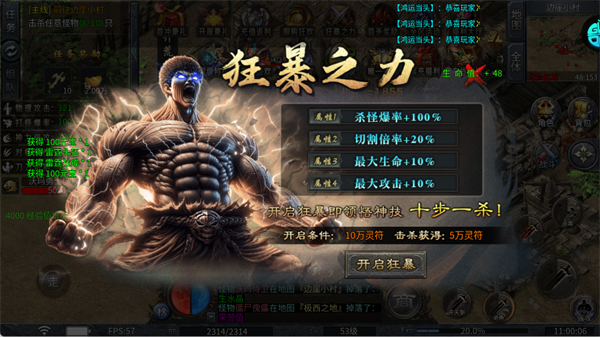 消耗10万灵符开启狂暴状态,可获得杀怪爆率、切割倍率等属性加成,同时解锁神技“十步一杀”。