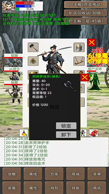 7、重点是要刷尸王(僵尸洞最后一层),打出〔弧光剑法〕群攻技能,(技能学了自动释放,技能熟练度靠重复学习技能书,3级满)背包大红药买满还打不过话就去低级图沉淀沉淀,升一下等级或者打高防装备再去干尸王刷出群攻技能