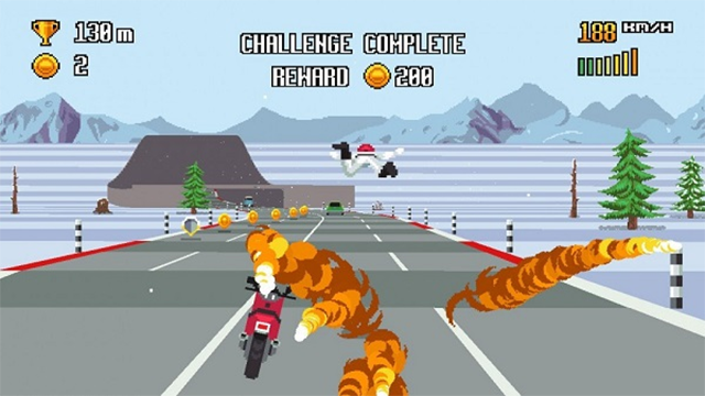 像素摩托车(Retro Highway)又称为复古公路赛、复古高速,是一款像素风格的赛车竞速类游戏。在复古像素8-bits的画风里,不免让人回想起曾经的《暴力摩托》岁月,像素摩托车操作非常简单,左右两侧的箭头位置是控制摩托车左右移动的方向按键,通过灵活的方向,争取行驶到更远的距离!不同的是,像素摩托车相比前辈暴力摩托少了些动作元素,多了些道具、场景和车型,玩家在游戏时需要尽可能收集道路两侧的金币,因为金币是解锁后期各种极品道具的关键。