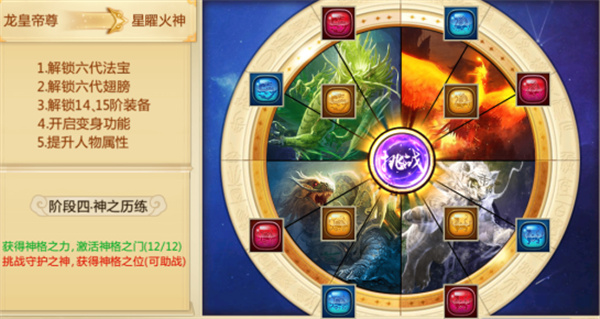 4、神之历练:使用四种钥匙(击杀500级以上BOSS掉落/商店购买/使用元宝代替)或者经验(巅峰230级以上经验)激活对应的神格,全部激活后点击“挑战”开启封神副本挑战,胜利并且等级在巅峰250以上即可完成转职
