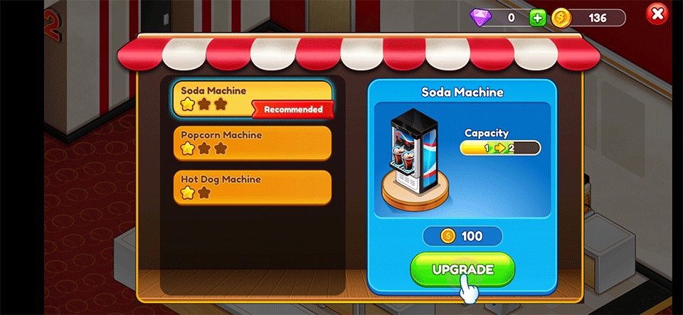 改进你的影院设备和设施,提升服务质量和顾客满意度。升级零食机、爆米花机、饮料机等等,让你的影院运营顺畅!