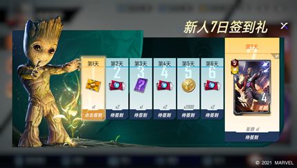 前7日登录游戏进行签到,即可每天领取超值好礼。累积签到7天,更可在蜘蛛侠、星爵、钢铁侠、索尔中自选一张传奇橙卡!