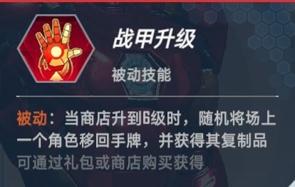 战甲升级:被动,当前商店升到6级时,随机将场上一个角色移回手牌,并获得其复制品。