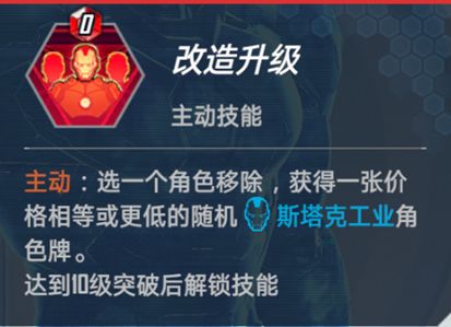 改造升级:主动,不消耗宝石,选一个角色移除,获得一张价格相等或者更低的随机斯塔克工业角色牌。