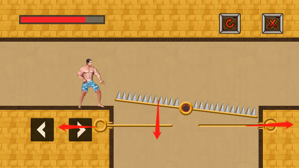 初次进入关卡,我们首先将水池上方的拉环向下抽,再将上方拉环抽出,让岩浆与水池融合并抵消