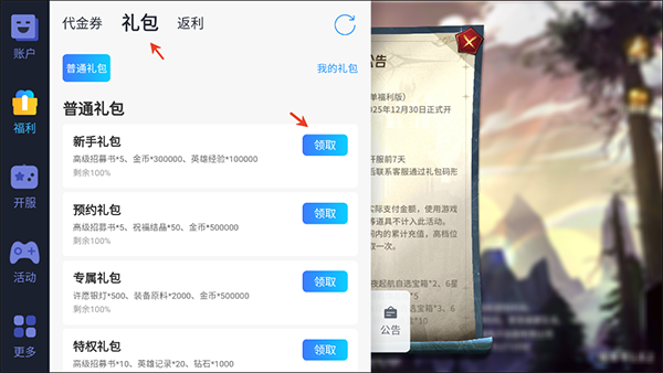 2、在进入的界面选择礼包,然后选择下方的领取。
