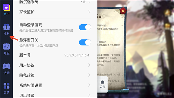 1、进入游戏内点击小弹窗,然后选择右边的福利。