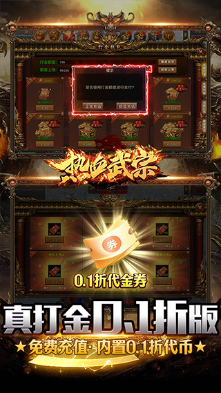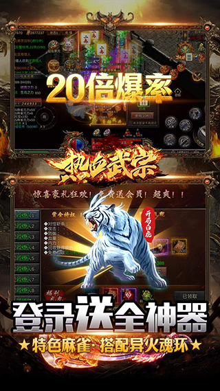 热血武宗是一款经典传奇全新高攻速高爆率版本手游,游戏上线送SVIP1直升卡16888绑定灵符,300w元宝,神兽白虎*1,登录免费送全神器,上线即拥有400%满攻速及200%移动速度!超高爆率刀刀爆光柱,神装神器全能爆,海量道具灵符回收,专属打金系统,仅需打怪即可获得打金点进行免费充值,还有内置0.1折代金券,仅需1元即可抵扣100元充值!如果你是传奇游戏的忠实粉丝,那么千万不要错过热血武宗消除版哦~