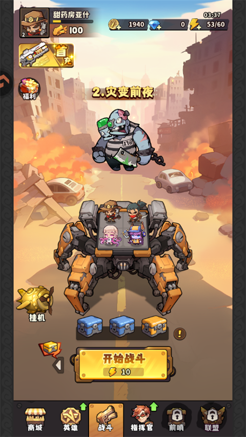 1、打开出征吧勇士手游,点击开始战斗,每次战斗需要消耗电量