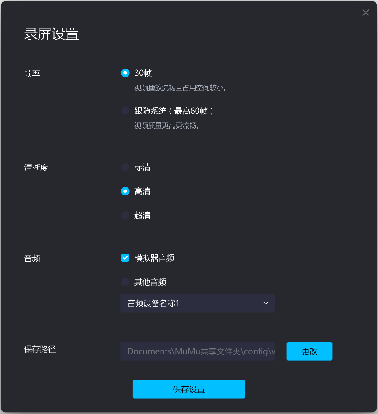 (4)保存路径:录屏文件默认保存路径为MuMu共享文件夹,点击更改可修改录屏文件保存路径,建议更改为存储空间充足的磁盘路径。