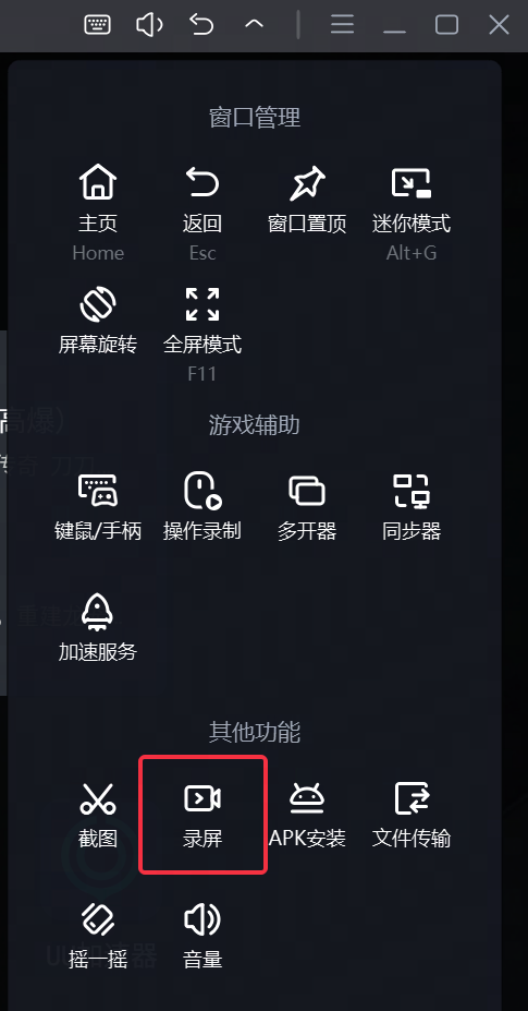 第一步,点击模拟器右上角“V”-下拉工具栏,点击“录屏”入口,呼出录屏功能浮窗,再点击红色按钮,倒计时3秒后开始录屏,也可通过快捷键开始录屏(可在模拟器设置中心内设置录屏快捷键)。