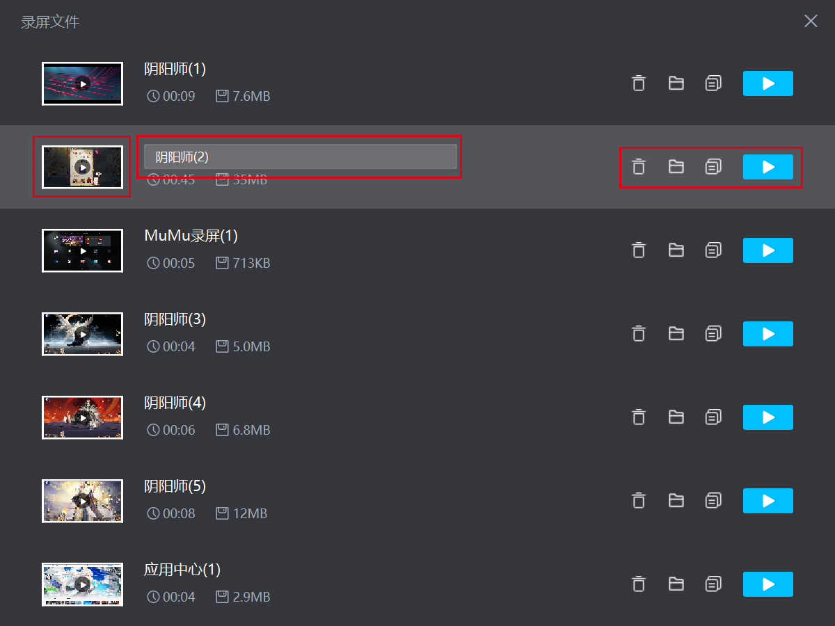 点击缩略图或播放按钮,可直接播放录屏文件,此外还可以对文件进行重命名、删除文件、打开文件所在位置、复制文件到剪切板等操作。
