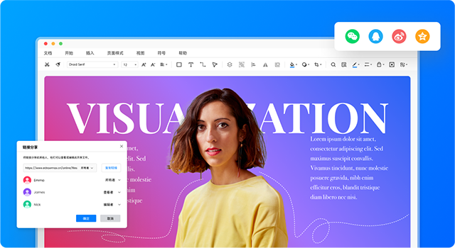亿图图示网页版支持在线协作,轻松共享、管理团队文件;同时支持一键分享到微信、微博、QQ等社交平台,让沟通更便捷。
