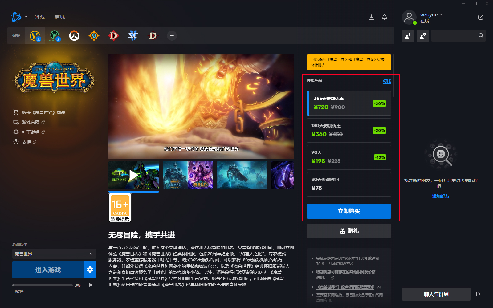 4、同时游戏需要购买游戏时间,支持购买365天,180天,90天,30天时间;