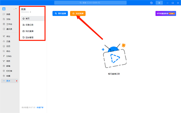1、打开钉钉电脑版软件,在左边任务栏点击【更多】选项,然后选择【直播】选项,